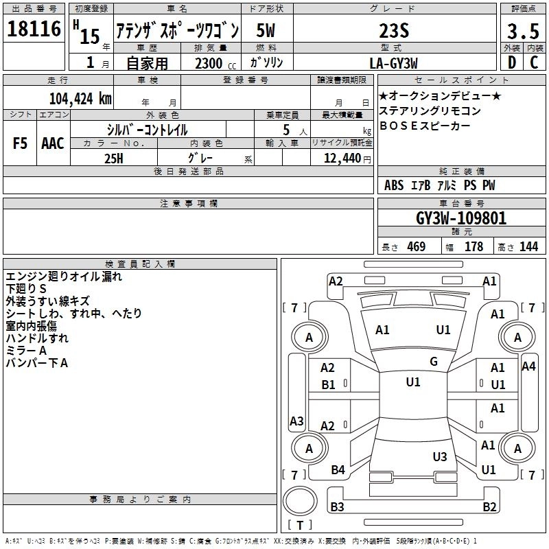 | 23S | UA-GY3W | L3-VE | FF | 4AT | 2260cc | 178ps(131kW)/6500rpm | AИ-95 | 2 300 000 | |