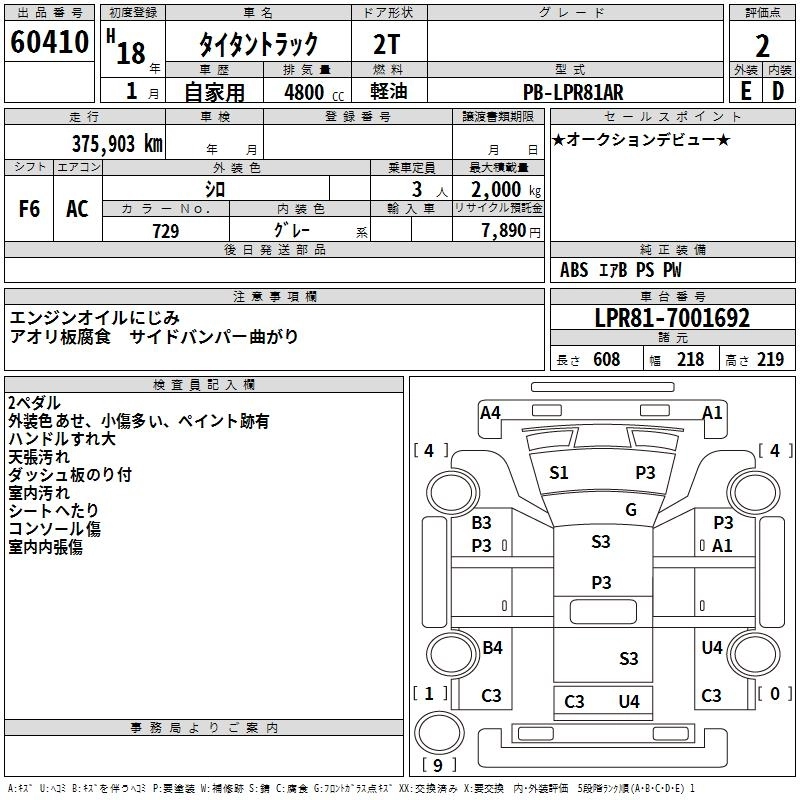 Год выпуска2006 Пробег 376 000 км КузовLPR81AR Комплектация COMMON BODY