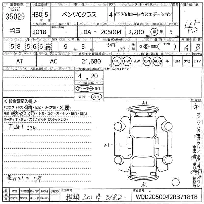 MERCEDES BENZ C CLASS 2018 г., лот № 35029