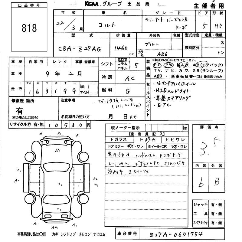 | RALLIART VERSION R SPECIAL | CBA-Z27AG | 4G15 MIVEC TURBO | FF | 5MT | 1468cc | 163ps(120kW)/6000rpm | AИ-95 | 2 320 500 |