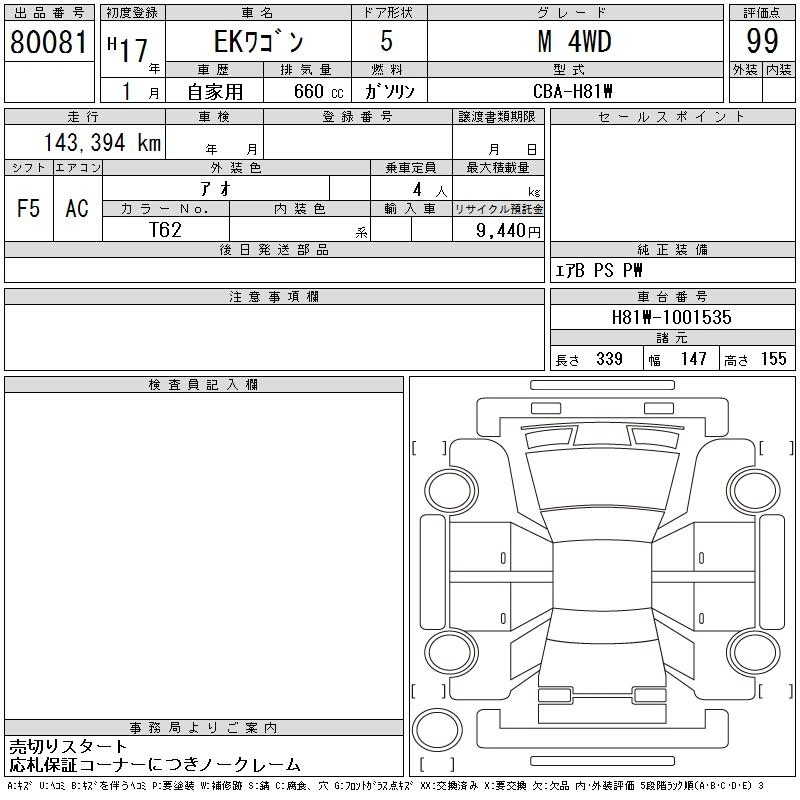 | M | DBA-H81W | 3G83 | FF | 5MT | 657cc | 50ps(37kW)/6500rpm | AИ-92 | 913 500 | |