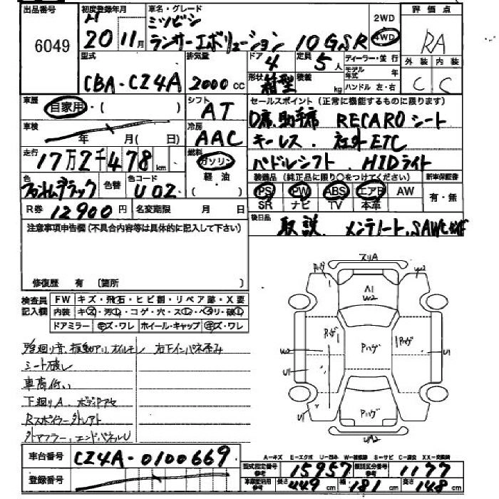 | GSR PREMIUM EVOLUTION X | CBA-CZ4A | 4B11 MIVECインタークーラーターボ | Full-time 4WD | 5MT | 1998cc | 300ps(221kW)/6500rpm | AИ-95 | 4 798 500 | |