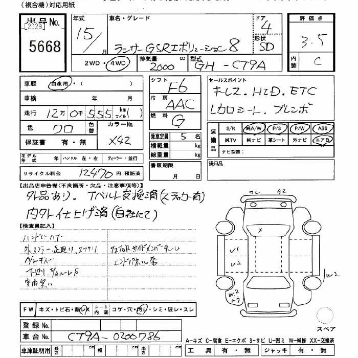 | RS EVOLUTION VIII | GH-CT9A | 4G63ターボ | Full-time 4WD | 5MT | 1997cc | 280ps(206kW)/6500rpm | AИ-95 | 2 740 000 |