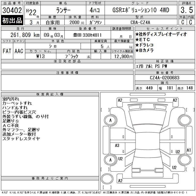 | GSR PREMIUM EVOLUTION X | CBA-CZ4A | 4B11 MIVECインタークーラーターボ | Full-time 4WD | 6AT | 1998cc | 300ps(221kW)/6500rpm | AИ-95 | 5 229 000 | |