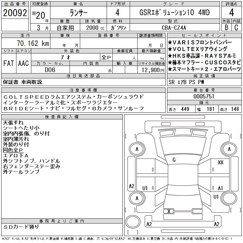 | GSR PREMIUM EVOLUTION X | CBA-CZ4A | 4B11 MIVECインタークーラーターボ | Full-time 4WD | 6AT | 1998cc | 300ps(221kW)/6500rpm | AИ-95 | 5 050 500 | |