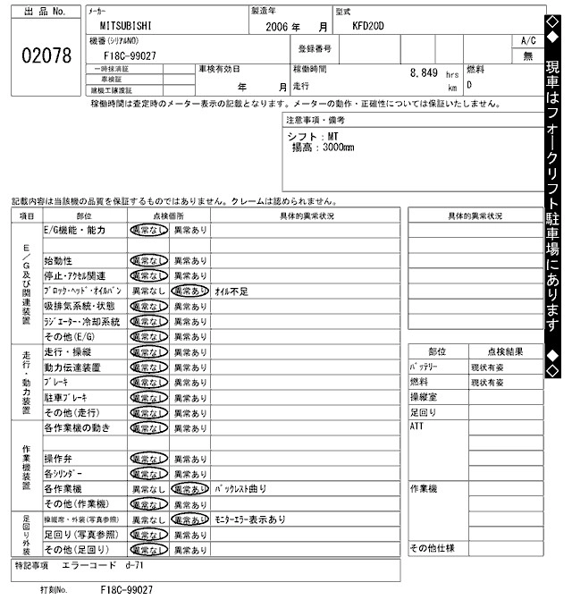 Год выпуска2006 Пробег 9 000 км КузовKFD20D Комплектация FORKLIFT