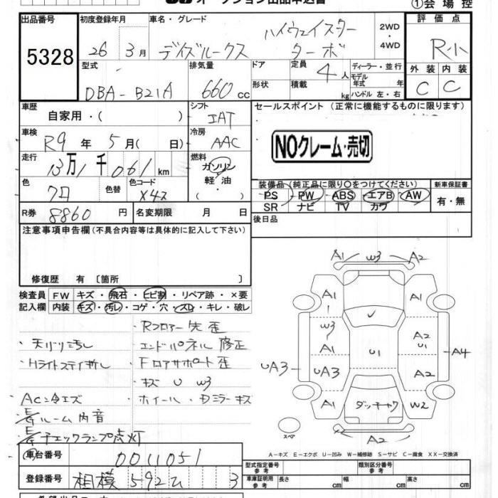 | HIGHWAY STAR X V SELECTION +SAFETY II | DBA-B21A | 3B20 | Full-time 4WD | CVT | 659cc | 49ps(36kW)/6500rpm | AИ-92 | 1 715 040 | |