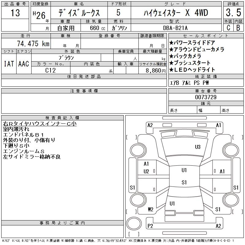 | HIGHWAY STAR X V SELECTION +SAFETY II | DBA-B21A | 3B20 | Full-time 4WD | CVT | 659cc | 49ps(36kW)/6500rpm | AИ-92 | 1 715 040 | |