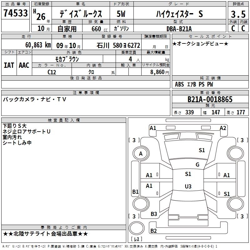 | HIGHWAY STAR X V SELECTION +SAFETY II | DBA-B21A | 3B20 | Full-time 4WD | CVT | 659cc | 49ps(36kW)/6500rpm | AИ-92 | 1 715 040 | |