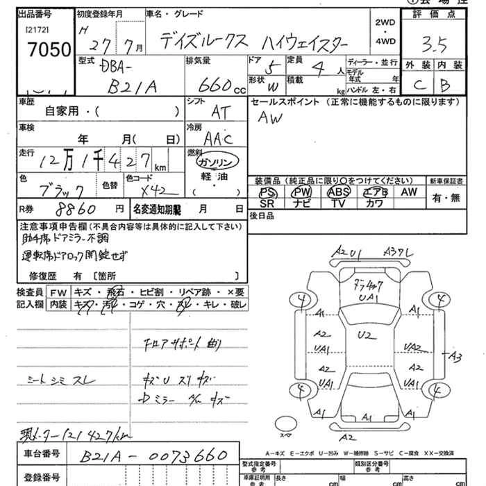 | HIGHWAY STAR X V SELECTION | DBA-B21A | 3B20 | Full-time 4WD | CVT | 659cc | 49ps(36kW)/6500rpm | AИ-92 | 1 804 680 | |
