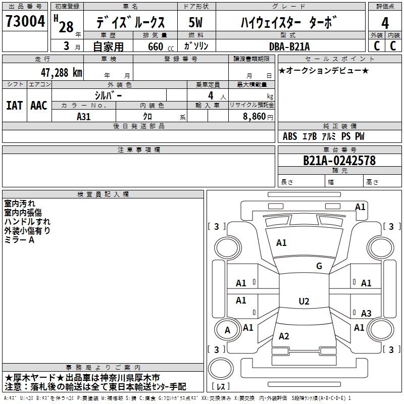 | HIGHWAY STAR X V SELECTION | DBA-B21A | 3B20 | Full-time 4WD | CVT | 659cc | 49ps(36kW)/6500rpm | AИ-92 | 1 804 680 | |