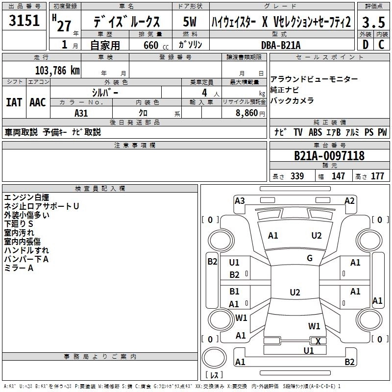 | HIGHWAY STAR X V SELECTION | DBA-B21A | 3B20 | Full-time 4WD | CVT | 659cc | 49ps(36kW)/6500rpm | AИ-92 | 1 804 680 | |