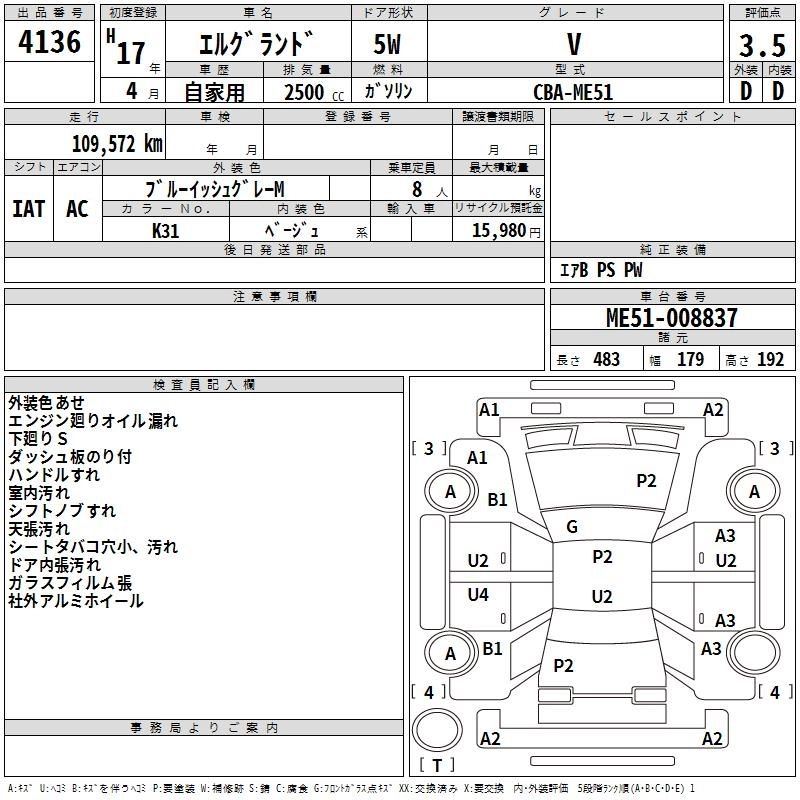 | RIDER ALPHA | CBA-ME51 | VQ25DE | FR | 5AT | 2495cc | 186ps(137kW)/6000rpm | AИ-92 | 3 507 000 | |