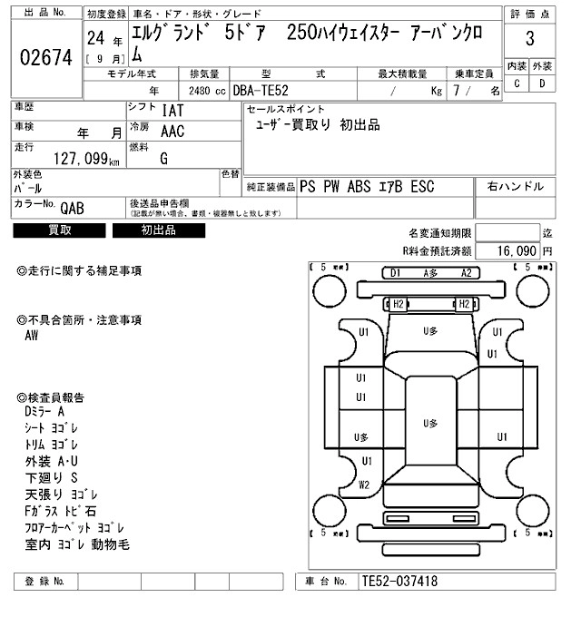 | 250HIGHWAY STAR BLACK LEATHER | DBA-TE52 | QR25DE | FF | CVT | 2488cc | 170ps(125kW)/5600rpm | AИ-92 | 3 669 750 | |