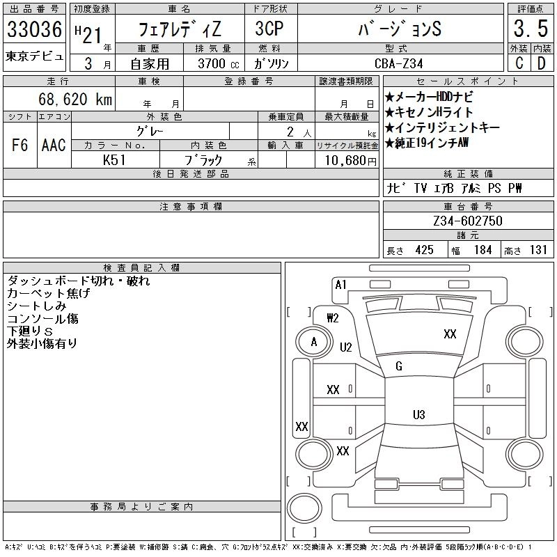 | BASE GRADE | CBA-Z34 | VQ37VHR | FR | 7AT | 3696cc | 336ps(247kW)/7000rpm | AИ-95 | 3 748 500 | |