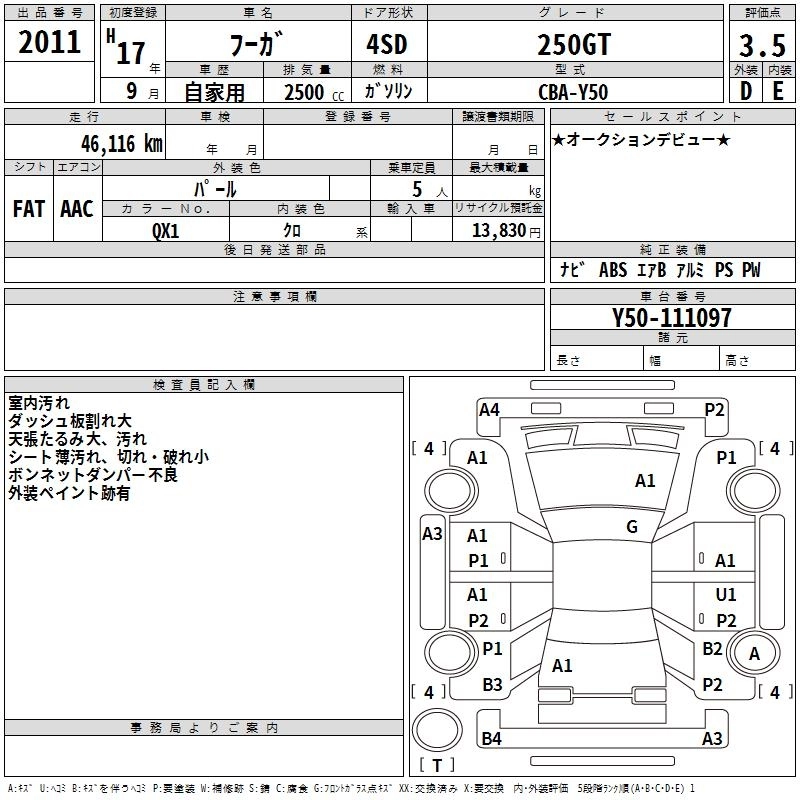 | 350GT STYLISH BLACK LIMITED | CBA-PY50 | VQ35DE(NEO) | FR | 5AT | 3498cc | 280ps(206kW)/6200rpm | AИ-95 | 4 383 750 | |