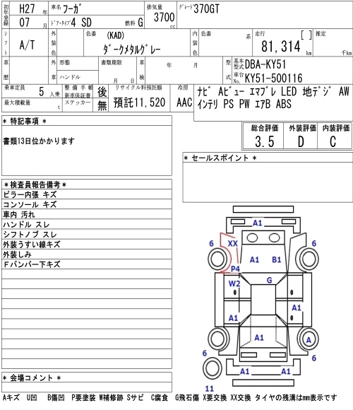 | 370GT FOUR COOL EXCLUSIVE | DBA-KNY51 | VQ37VHR | Full-time 4WD | 7AT | 3696cc | 333ps(245kW)/7000rpm | AИ-95 | 5 828 760 | |