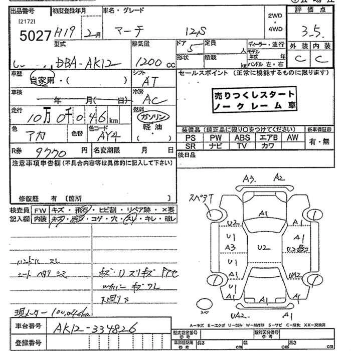 | 12S PLUS NAVI HDD | DBA-AK12 | CR12DE | FF | 4AT | 1240cc | 90ps(66kW)/5600rpm | AИ-92 | 1 261 050 | |