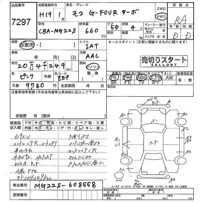 | G | CBA-MG22S | K6A | FF | 4AT | 658cc | 60ps(44kW)/6000rpm | AИ-92 | 1 247 400 | |