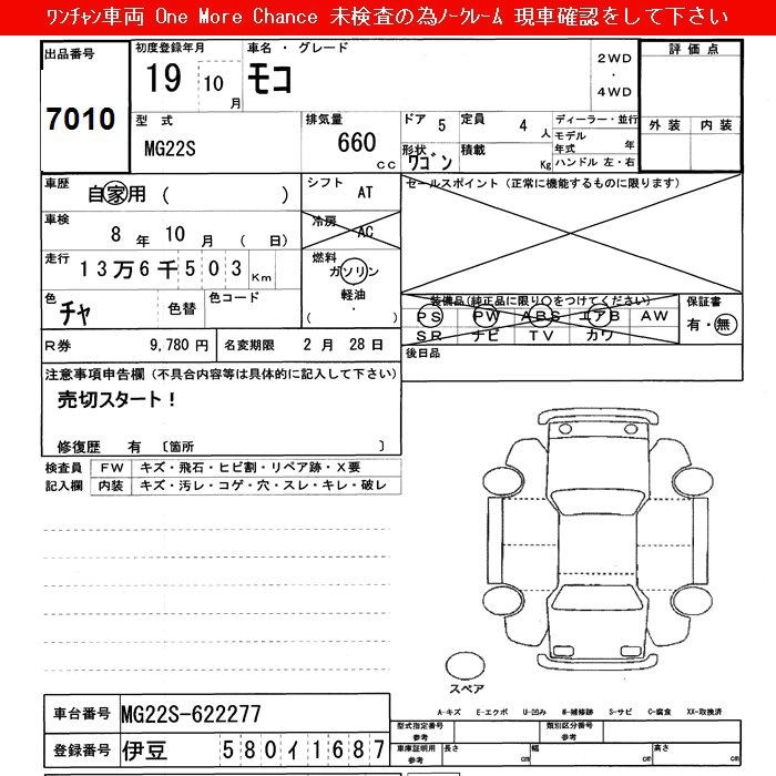 | G | CBA-MG22S | K6A | FF | 4AT | 658cc | 60ps(44kW)/6000rpm | AИ-92 | 1 247 400 | |