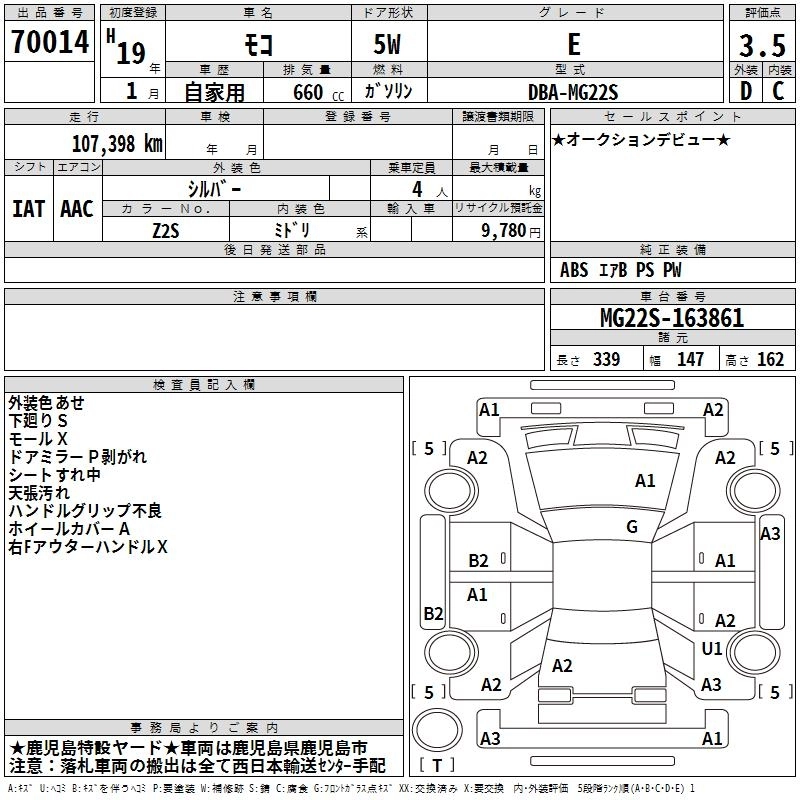 | G | CBA-MG22S | K6A | FF | 4AT | 658cc | 60ps(44kW)/6000rpm | AИ-92 | 1 247 400 | |