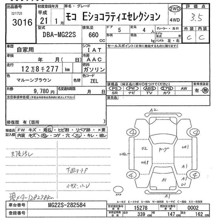 | E CHOCOLATIER AERO STYLE PLUS NAVI | DBA-MG22S | K6A | FF | 4AT | 658cc | 54ps(40kW)/6500rpm | AИ-92 | 1 290 450 | |