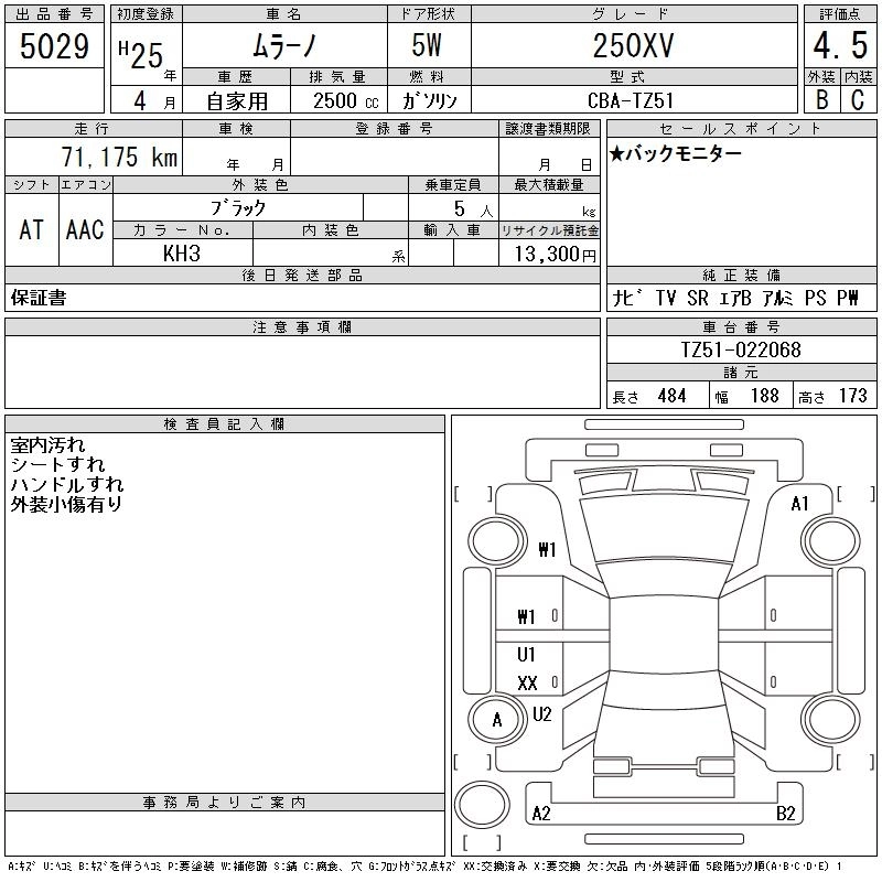 | 250XV FOUR MODE-BIANERO | CBA-TNZ51 | QR25DE | Full-time 4WD | CVT | 2488cc | 170ps(125kW)/5600rpm | AИ-92 | 4 287 150 | |