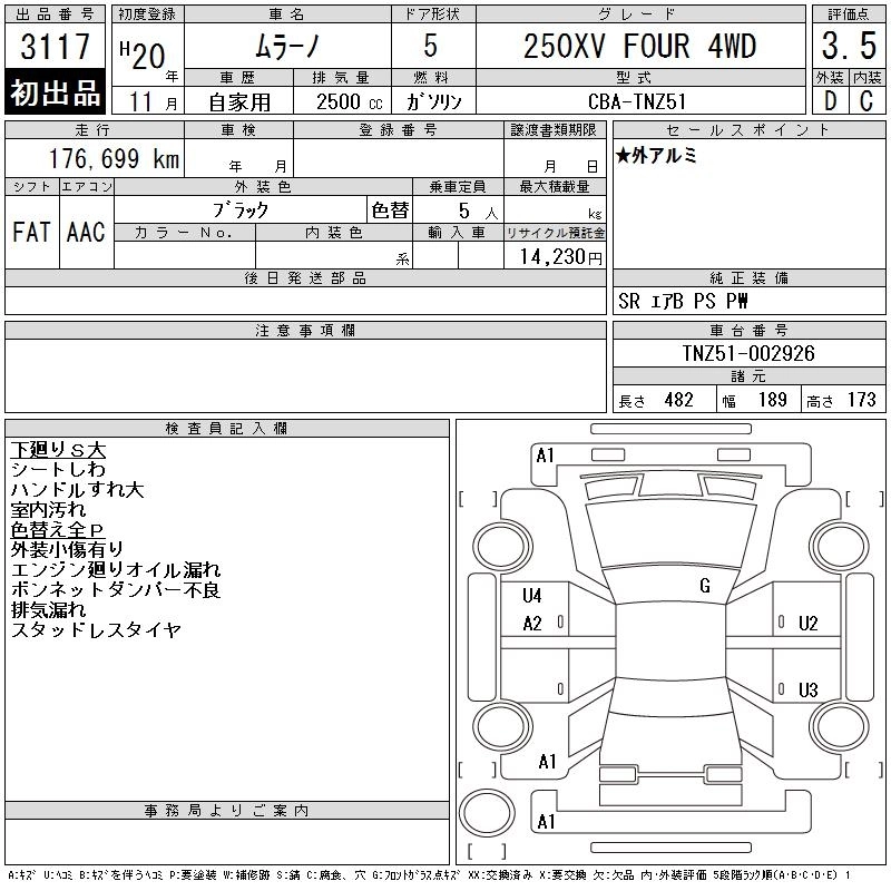 | 350XV FOUR | CBA-PNZ51 | VQ35DE | Full-time 4WD | CVT | 3498cc | 260ps(191kW)/6000rpm | AИ-95 | 4 042 500 | |