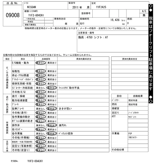 Год выпуска2011 Пробег 16 000 км КузовY1F2A25 Комплектация FORKLIFT