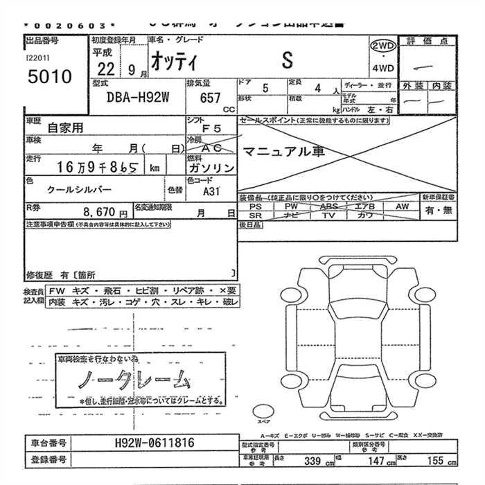 | S | DBA-H92W | 3G83 | FF | 5MT | 657cc | 50ps(37kW)/6500rpm | AИ-92 | 1 052 100 |