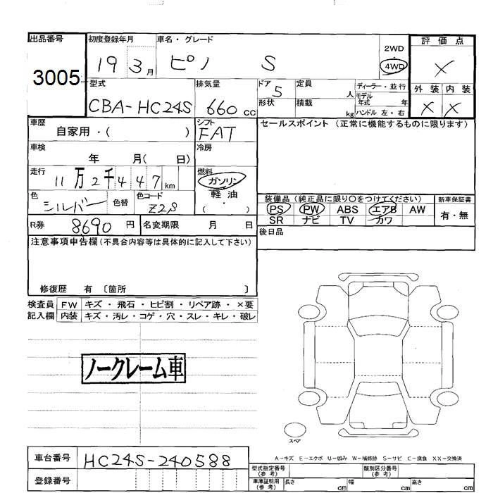 | S | DBA-HC24S | K6A | FF | 3AT | 658cc | 54ps(40kW)/6500rpm | AИ-92 | 913 500 | |