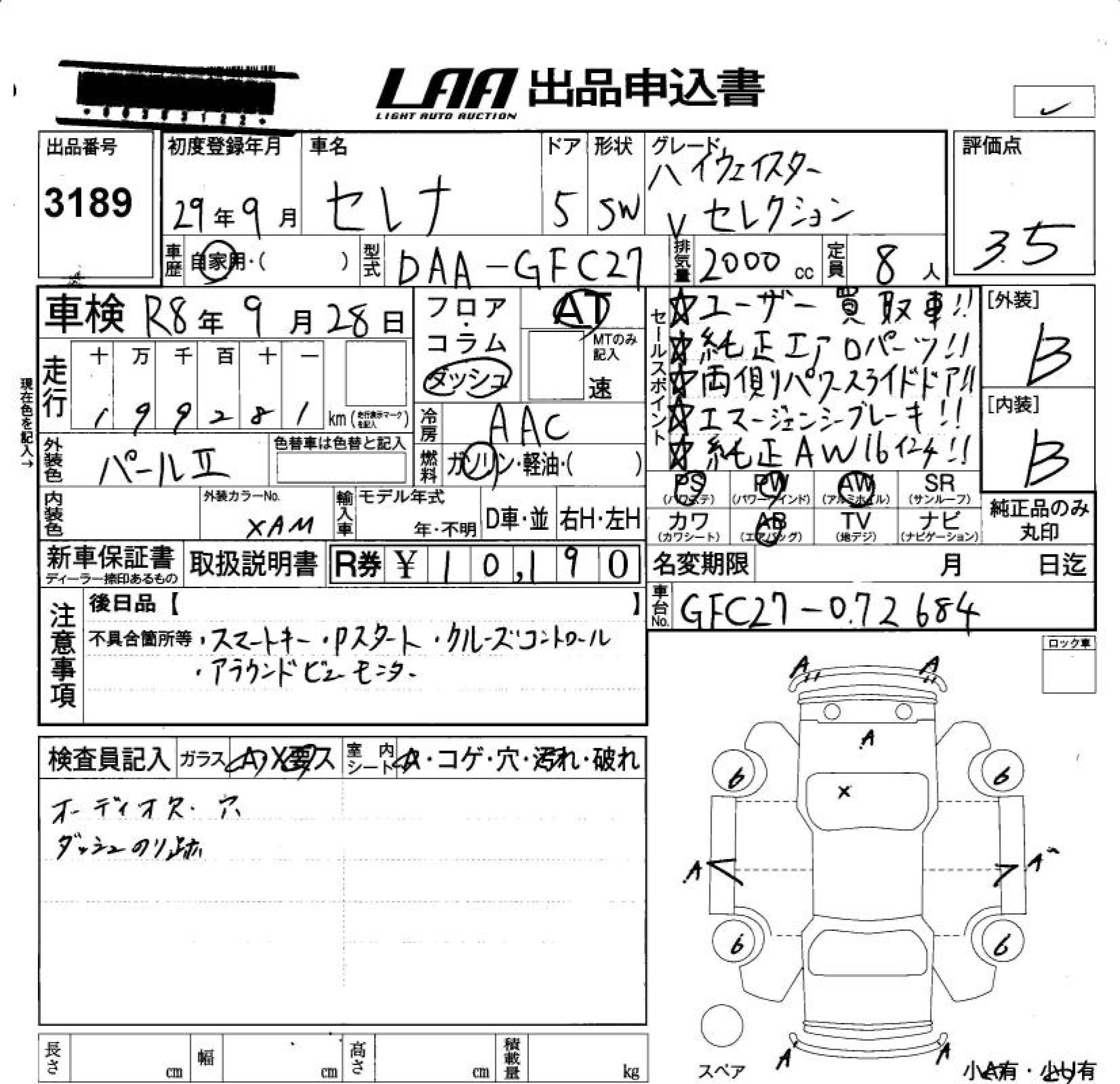 NISSAN SERENA 2017 г., лот № 3189