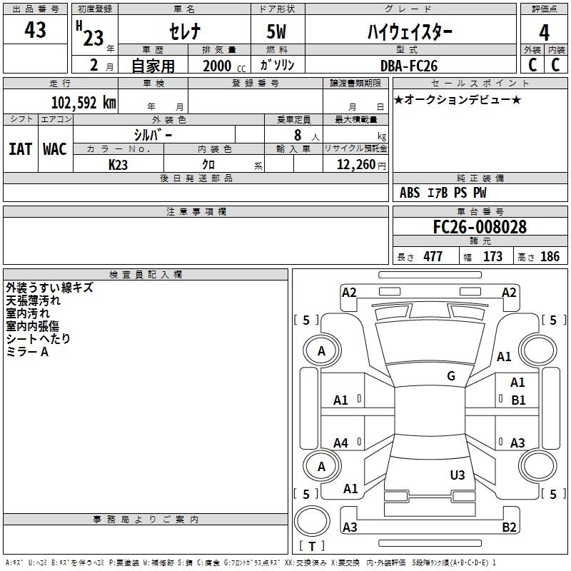 | HIGHWAY STAR V AERO SELECTION | DBA-FC26 | MR20DD | FF | CVT | 1997cc | 147ps(108kW)/5600rpm | AИ-92 | 2 795 100 |