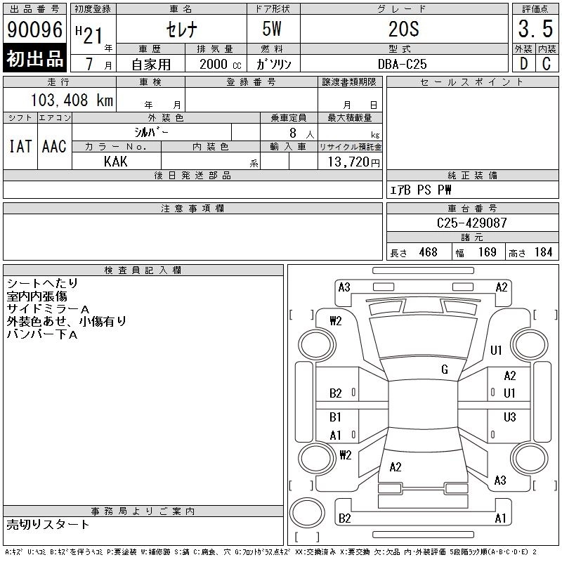 | 20S NAVI PLUS STEP SELECTION | DBA-C25 | MR20DE | FF | CVT | 1997cc | 137ps(101kW)/5200rpm | AИ-92 | 2 661 750 | |
