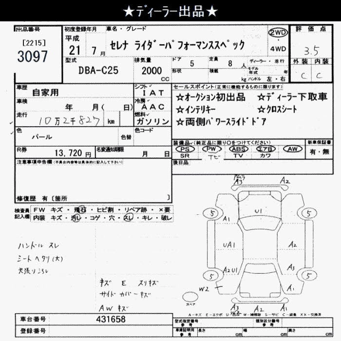 | 20S NAVI PLUS STEP SELECTION | DBA-C25 | MR20DE | FF | CVT | 1997cc | 137ps(101kW)/5200rpm | AИ-92 | 2 661 750 | |