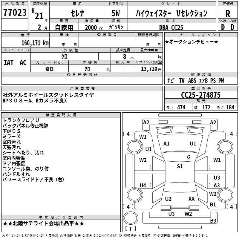 | HIGHWAY STAR V AERO SELECTION | DBA-CC25 | MR20DE | FF | CVT | 1997cc | 137ps(101kW)/5200rpm | AИ-92 | 2 625 000 |