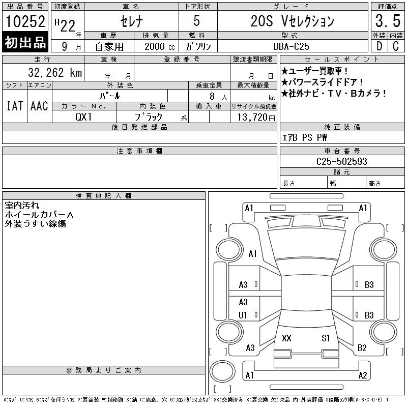 | HIGHWAY STAR V AERO SELECTION PLUS NAVI HDD | DBA-CC25 | MR20DE | FF | CVT | 1997cc | 137ps(101kW)/5200rpm | AИ-92 | 2 761 500 |