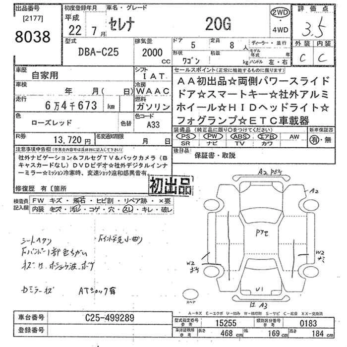 | HIGHWAY STAR V AERO SELECTION PLUS NAVI HDD | DBA-CC25 | MR20DE | FF | CVT | 1997cc | 137ps(101kW)/5200rpm | AИ-92 | 2 761 500 |