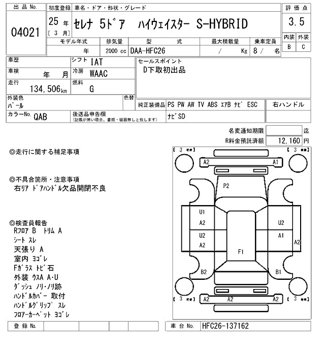 | 20G S-HYBRID | DAA-HC26 | MR20DD | FF | CVT | 1997cc | 147ps(108kW)/5600rpm | AИ-92 | 2 688 000 | |