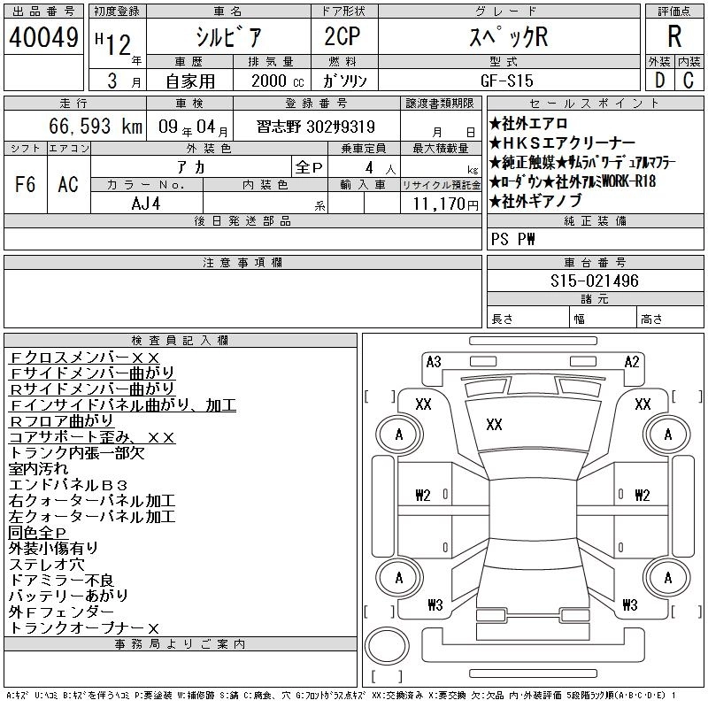 | SPEC-R TYPE B | GF-S15 | SR20DET | FR | 4AT | 1998cc | 225ps(165kW)/6000rpm | AИ-95 | 2 337 000 | |