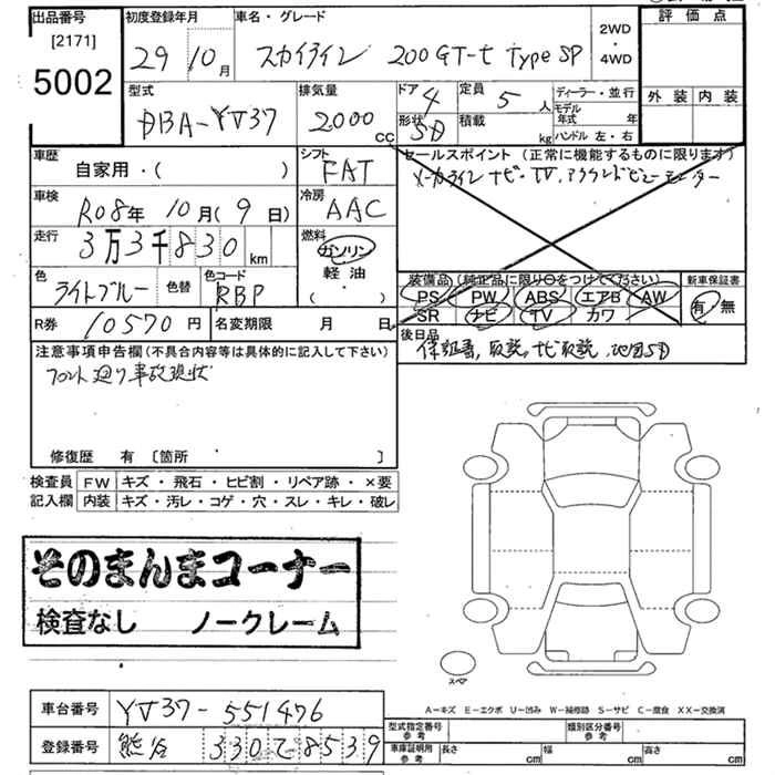| 200GT-T TYPE P | DBA-YV37 | 274A | FR | 7AT | 1991cc | 211ps(155kW)/5500rpm | AИ-95 | 4 433 400 | |