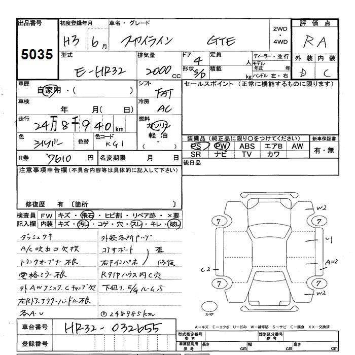 | GTS TYPE J | E-HR32 | RB20DE | FR | 4AT | 1998cc | 155ps(114kW)/6400rpm | AИ-95 | 2 322 000 | |
