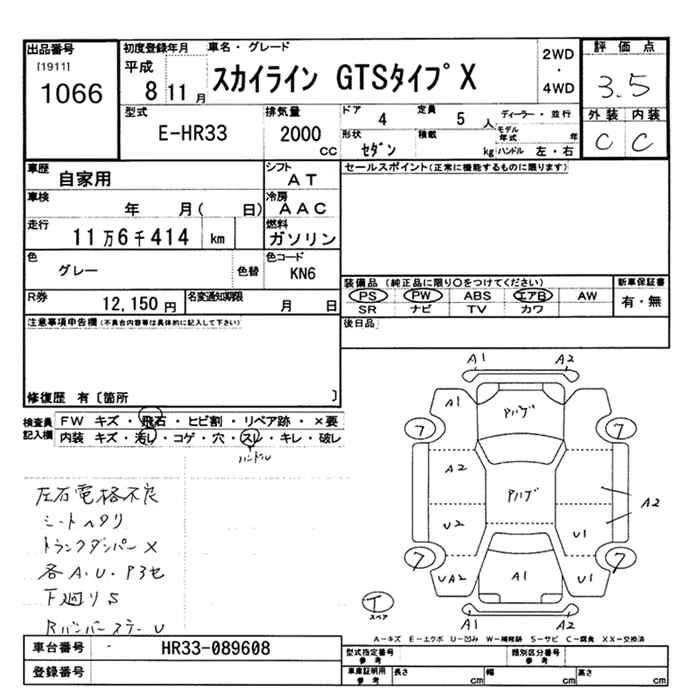 | GTS-4 TYPE X | E-ENR33 | RB25DE | Full-time 4WD | 5MT | 2498cc | 190ps(140kW)/6400rpm | AИ-95 | 3 052 000 | |