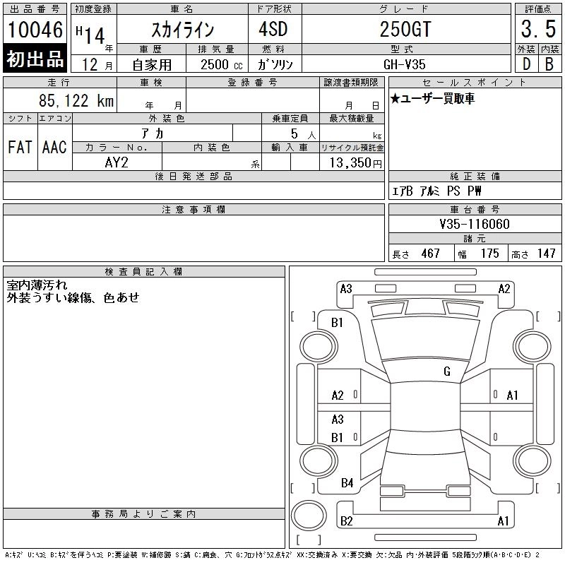 | 250GT FOUR S COLECTION | GH-NV35 | VQ25DD(NEO Di) | Full-time 4WD | 5AT | 2495cc | 215ps(158kW)/6400rpm | AИ-95 | 3 210 000 | |