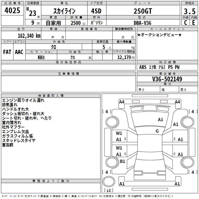 | 250GT FOUR TYPE P 55TH LIMITED | DBA-NV36 | VQ25HR | Full-time 4WD | 5AT | 2495cc | 225ps(165kW)/6400rpm | AИ-95 | 4 221 000 | |