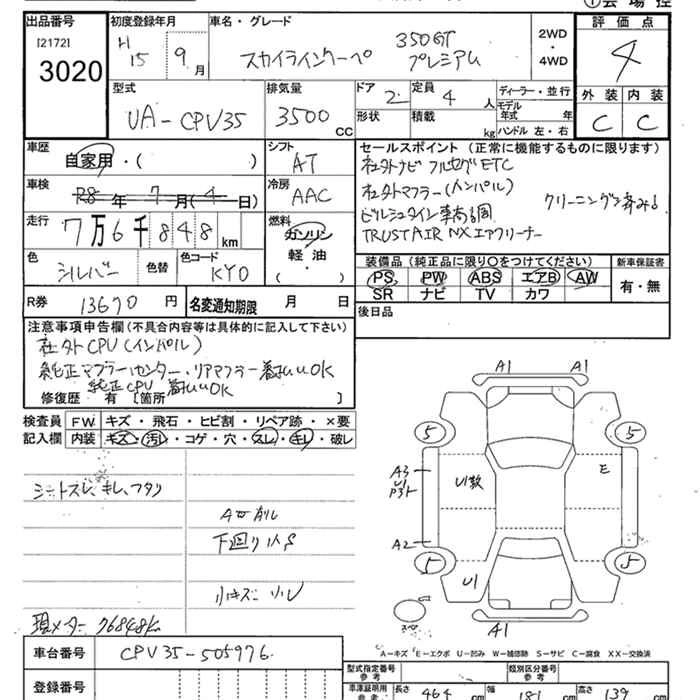 | 250GT FOUR PREMIUM 70TH-II | GH-NV35 | VQ25DD(NEO Di) | Full-time 4WD | 5AT | 2495cc | 215ps(158kW)/6400rpm | AИ-95 | 3 300 000 | |