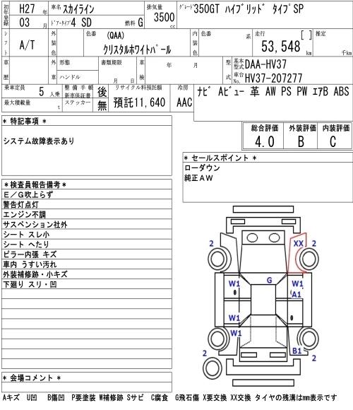 | 200GT-T TYPE SP COOL EXCLUSIVE | DBA-YV37 | 274A | FR | 7AT | 1991cc | 211ps(155kW)/5500rpm | AИ-95 | 4 929 120 | |