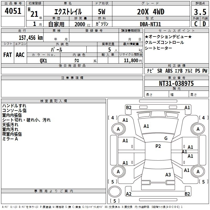 | DRIVING GEAR | DBA-NT31 | MR20DE | Full-time 4WD | CVT | 1997cc | 137ps(101kW)/5200rpm | AИ-92 | 2 425 500 | |