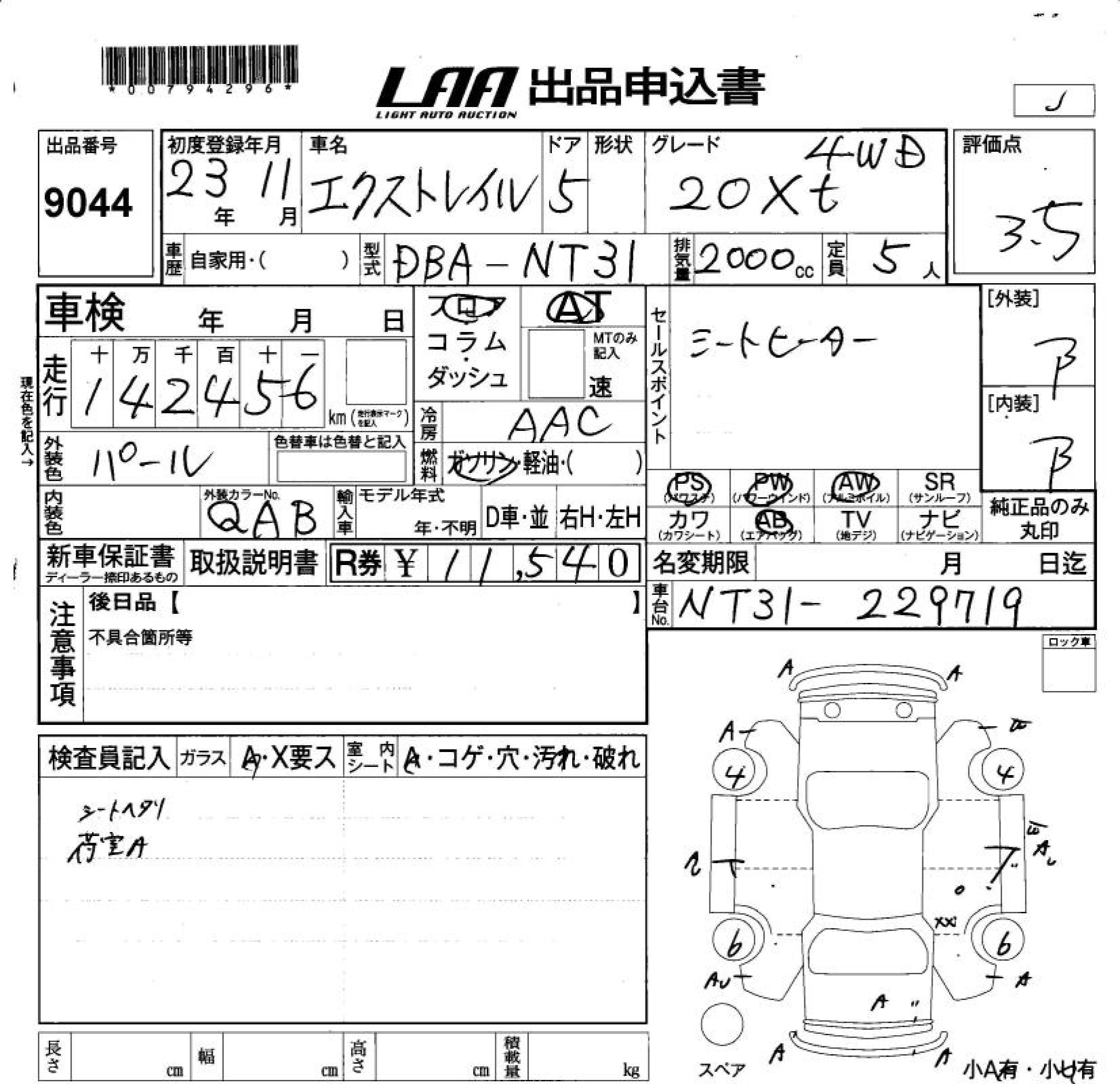 | 20XT | DBA-NT31 | MR20DE | Full-time 4WD | CVT | 1997cc | 137ps(101kW)/5200rpm | AИ-92 | 2 549 400 | |