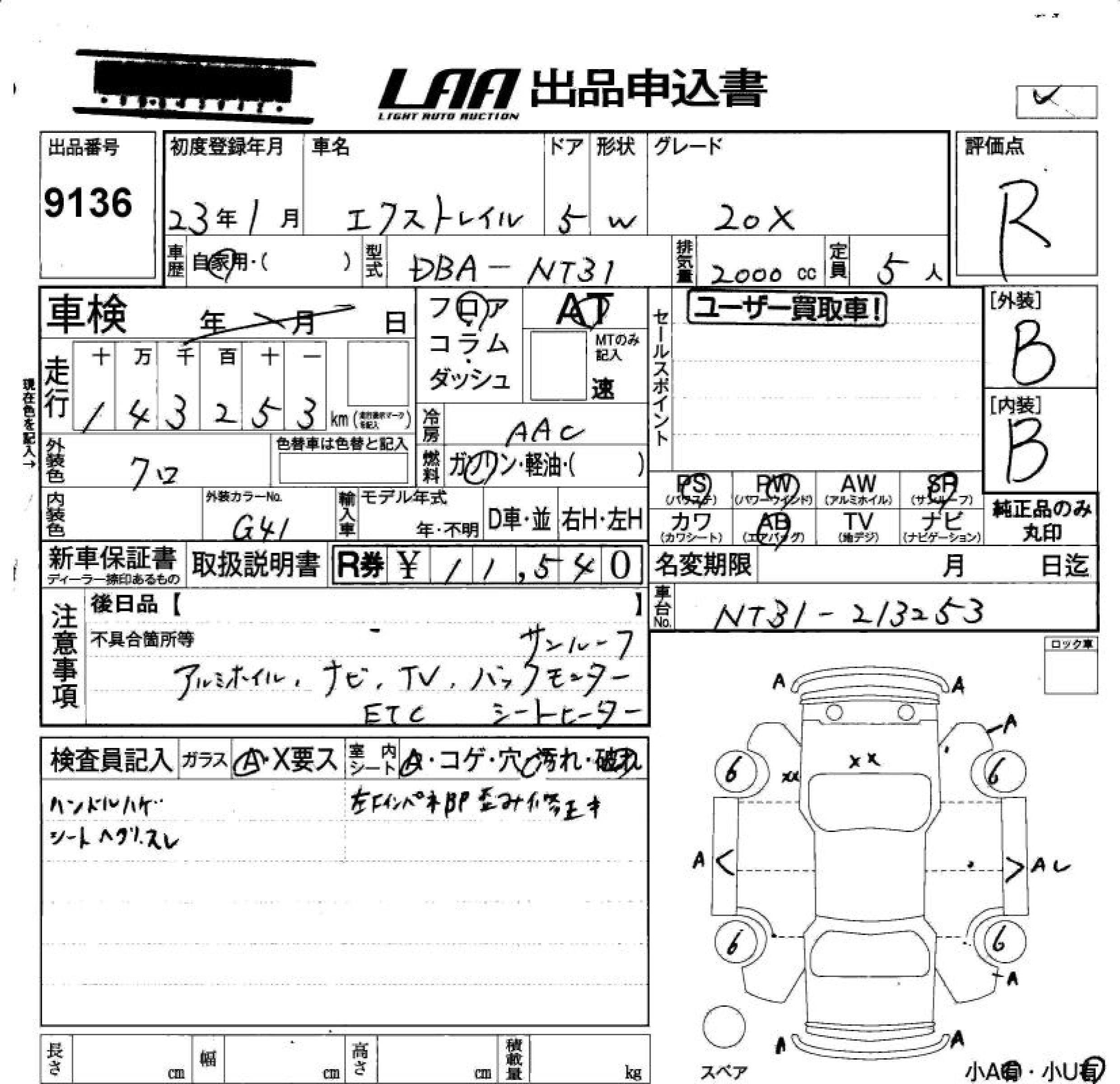 | 20XT | DBA-NT31 | MR20DE | Full-time 4WD | CVT | 1997cc | 137ps(101kW)/5200rpm | AИ-92 | 2 549 400 | |